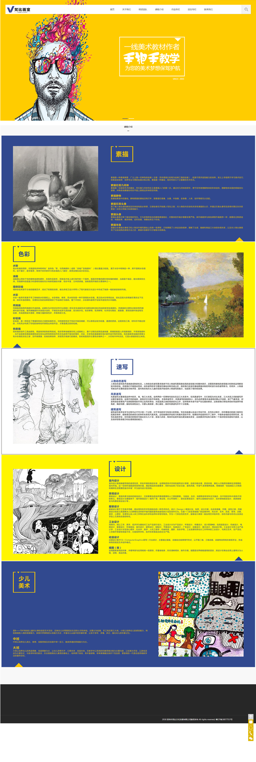 VANBE梵比画室,始创于2003年,是集中高考美术、成人美术、国际艺术预科、基础美术、少儿美术、美术考级、墙体彩绘、私人绘画作品定制、平面设计、室内设计和书籍出版等领域于一体的专业美术特训和教学研究的美术机构。